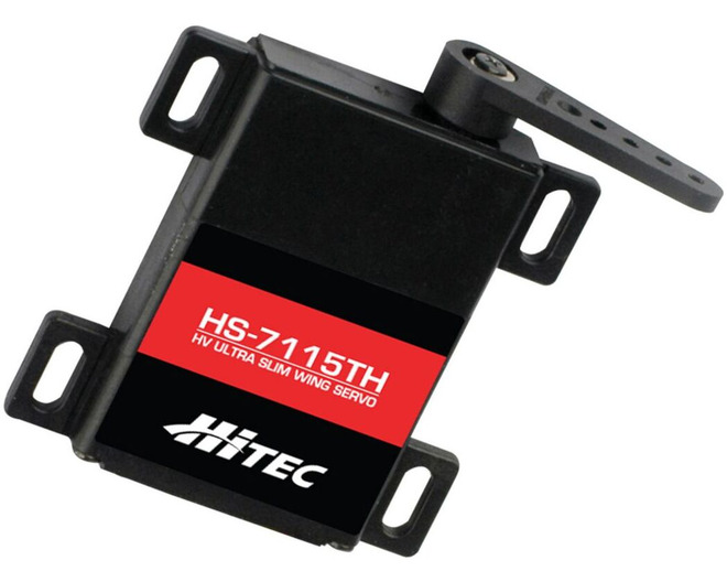 Overview The HS-7115TH will fulfill every pilot's dream when it comes to flying slim-wing aircraft. With its efficient, powerful three pole, metal-brushed motor and mighty titanium gear train, this servo brings the ultimate in high performance to your sailplanes, pylon racers and smaller scale models. The extremely thin, 8mm case with included mounting bracket allows it to fit into the tightest wings and most compact spaces. Constructed with dual ball bearings, the high voltage HS-7115TH provides an impressive 50 oz-in of torque at 7.4 volts. Specifications Size Category: Specialty Type: Digital Application: Sailplanes, pylon racers, smaller scale aircraft models Torque: 44 oz-in (3.2 kg-cm) @ 6.0V; 50 oz-in (3.6 kg-cm) @ 7.4V Speed: 0.12 sec/60° @ 6.0V; 0.10 sec/60° @ 7.4V Length: 1.50 in (38mm) Width: 1.02 in (26mm) Height: 0.31 in (8.0mm) Weight: 0.71 oz (20 g) Bushing Or Bearing: Bearing Bearing: Dual Motor Type: 3-pole ferrite Gear Type: Metal Gear Material: Titanium Voltage: 6.0V-7.4V <!-- |