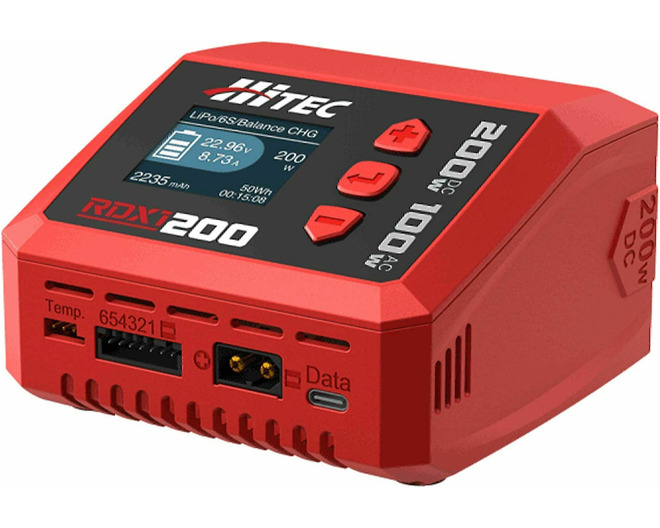 HRC44346RDX1 200 AC/DC Smart Balance Charger AC 100W / DC 200W $119.99Hitec's economically priced RDX1 200 is a compact and versatile charger designed to speedily charge your packs and meet the diverse needs of the entire RC community. FEATURES: Balance, Standard, Storage and Discharge Modes for All Lithium Battery ChemistriesTerminal Voltage Control Re-Peak Charge Mode and Delta-Peak Sensitivity for NiMH/NiCd Batteries Capacity Cut-Off Limit Smart Ventilation Fan Built-in Power Supply Function for Powering Devices up to 27V @ 10A SPECIFICATIONS: 100V - 240V AC Operating Voltage RangeLiPo, LiFe & LiIon Cell Count: 1-6 Cells NiCd/NiMH Cell Count: 1-15 Cells Pb Lead-Acid Based Cell Count: 2-20V Charge Circuit Power: 100W AC / 200W DC Discharge Circuit Power: 5W DIMENSIONS: 4.1 x 4.1 x 2.4 in. Weight: 0.75 lbs |